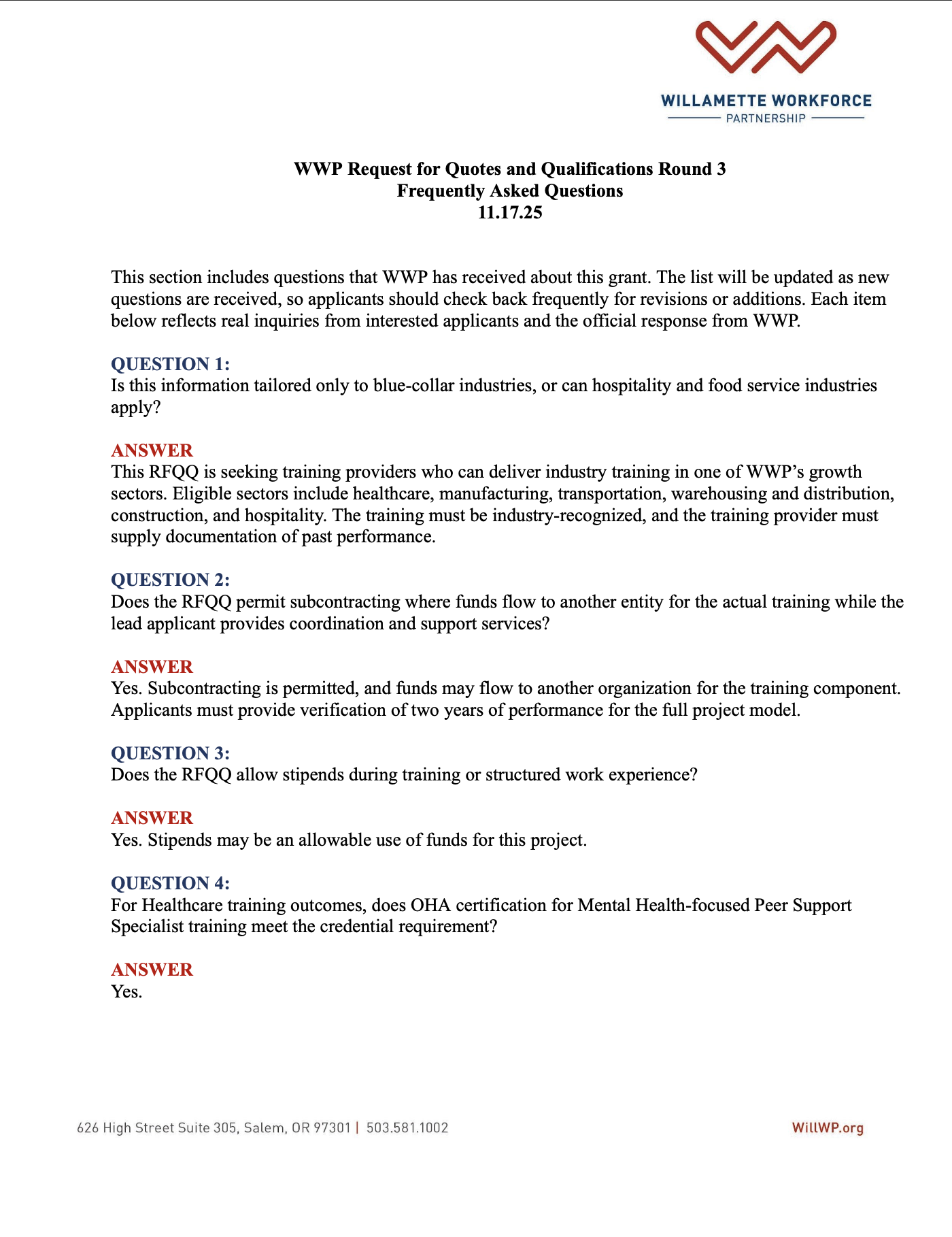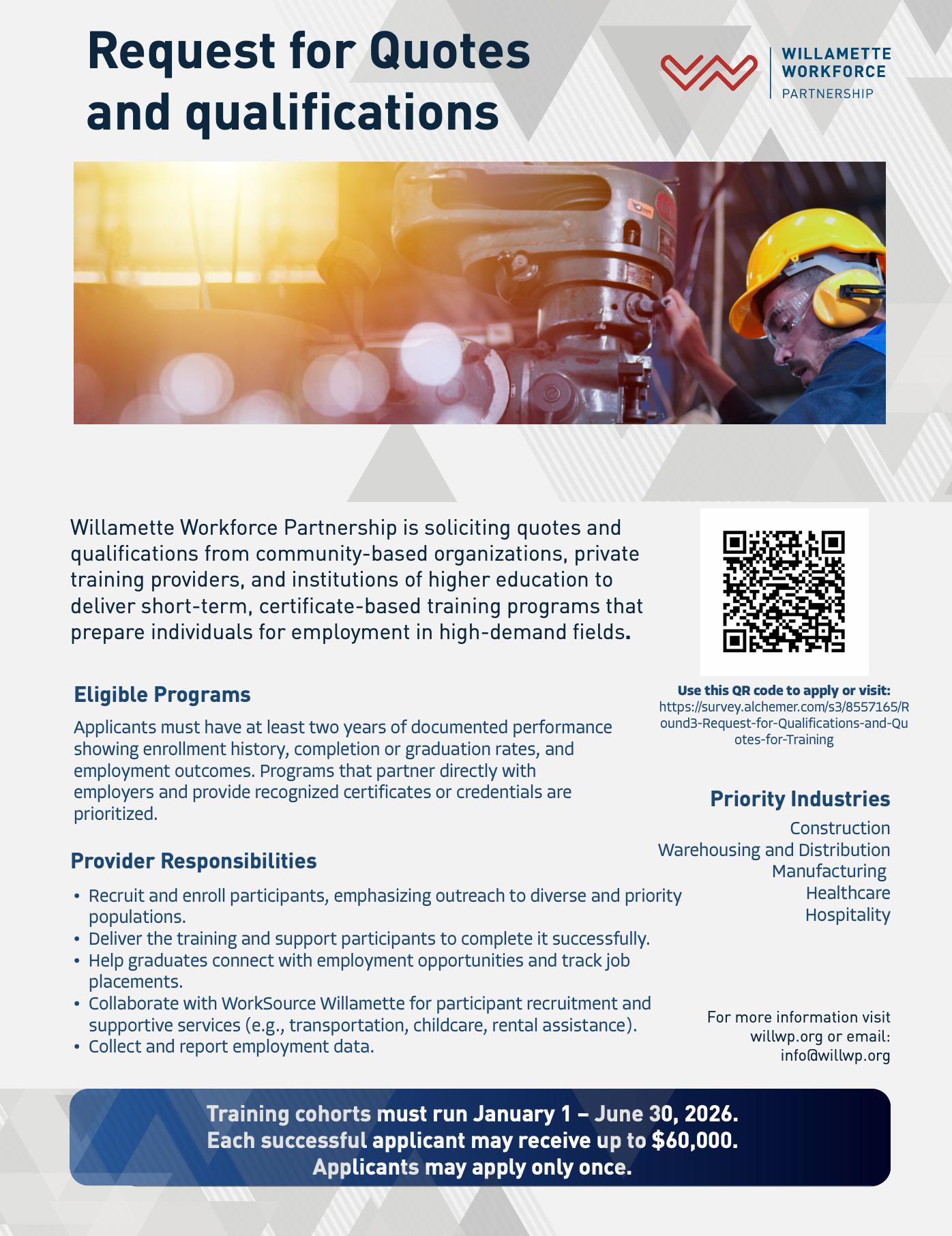 We are dedicated to helping job seekers gain the skills they need to thrive in today’s workforce. To that end, WWP is seeking qualified training partners to deliver short-term, certificate-based programs that prepare participants for competitive, high-demand careers across the Mid-Valley region.